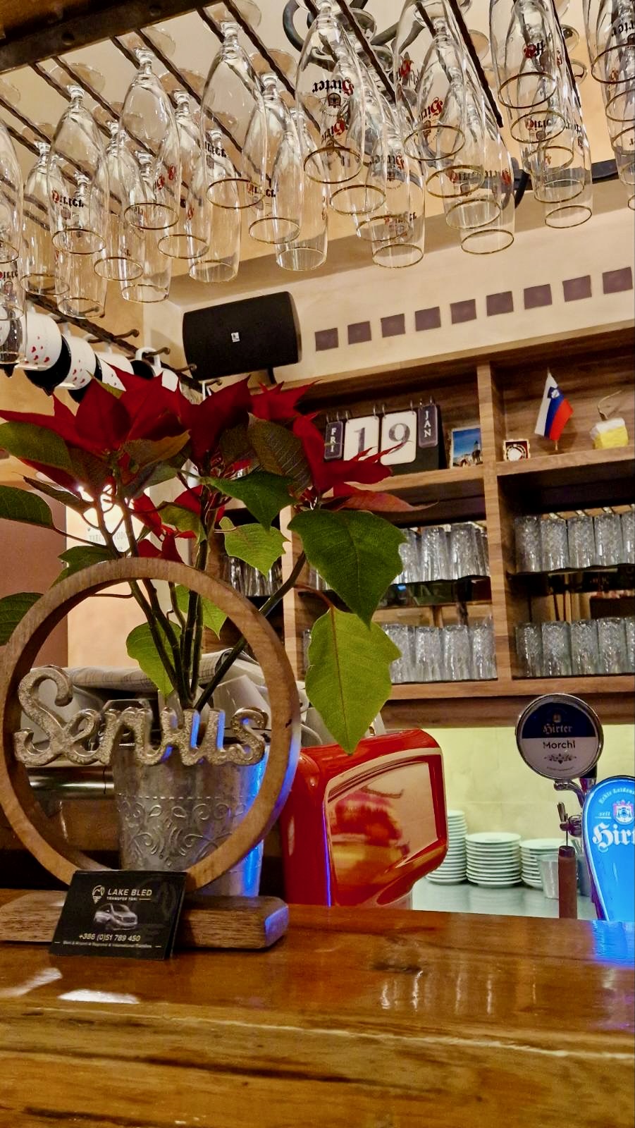Our restaurant is located in an excellent spot, just steps away from the beautiful Lake Bled. There is ample parking available for our guests.